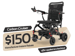 Whether traveling or at home, the Rascal ® Carbon Cruiser is designed with your convenience in mind. This lightweight, foldable electric wheelchair is only 42 lbs. without the battery and folds nearly flat in just seconds, making it easy to store in most vehicles. Its lithium battery is airline-compliant so you can take your unit on all your journeys near and far. The joystick and standard cup holder can attach to either armrest, however you prefer, and a battery range of up to 9.3 miles powers you through the day’s activities with ease. The Rascal® Carbon Cruiser is an FDA Class II Medical Device, meeting the most stringent testing standards for a top-quality mobility experience.