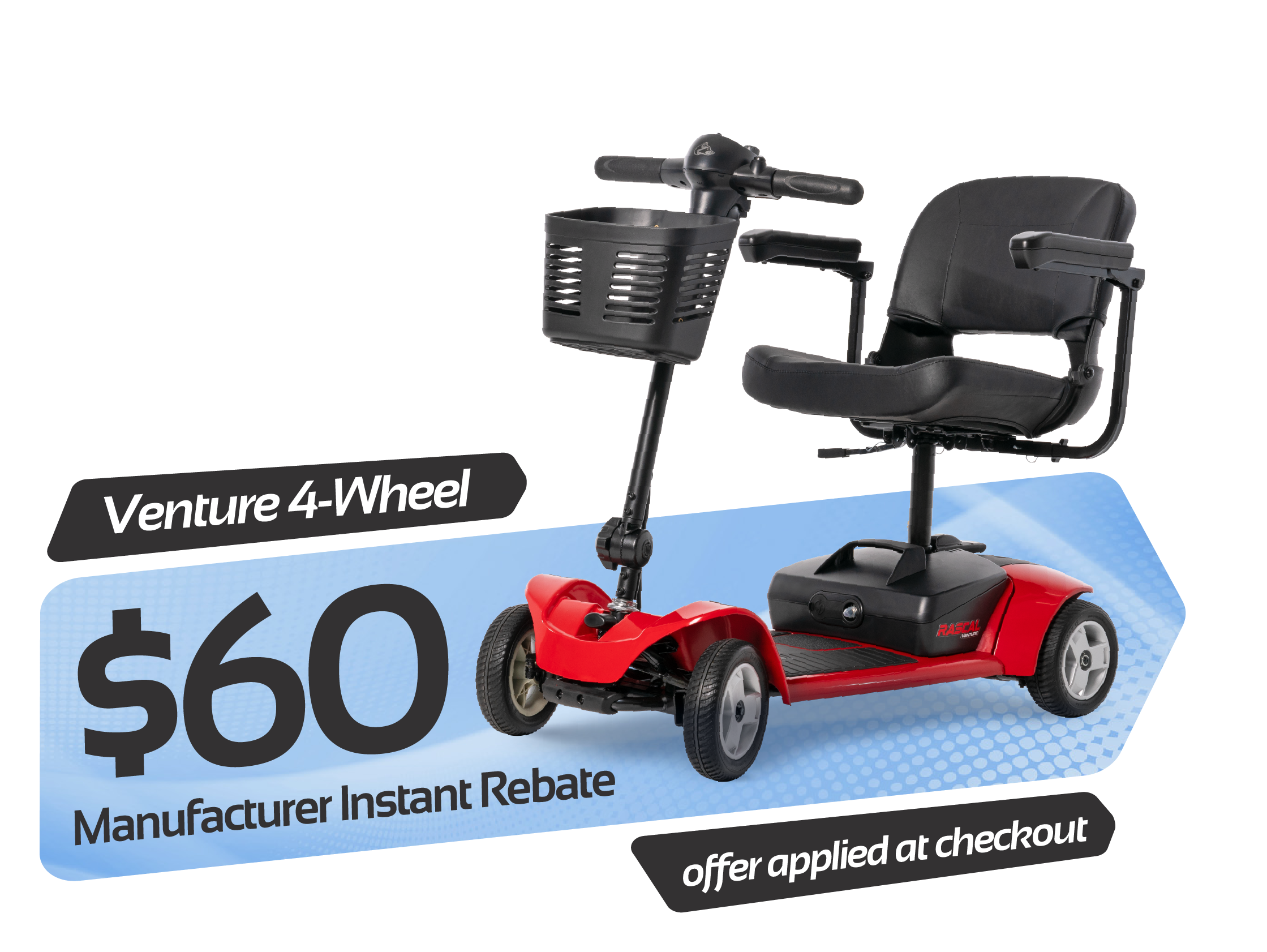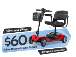 The Rascal® Venture 3-Wheel is a travel mobility scooter designed for maneuverability with a 300-lb. weight capacity. Its three 8-inch solid tires help you navigate tighter environments as you ride up to 10.1 miles (at 200 lbs.) on a single battery charge. A convenient disassembly process separates the unit into five lightweight pieces, making storage and transport a breeze
